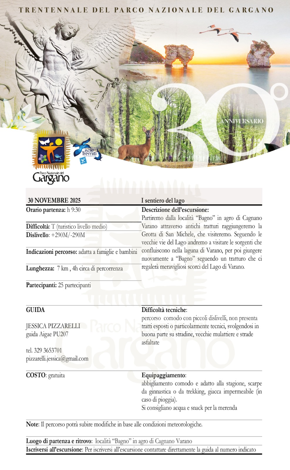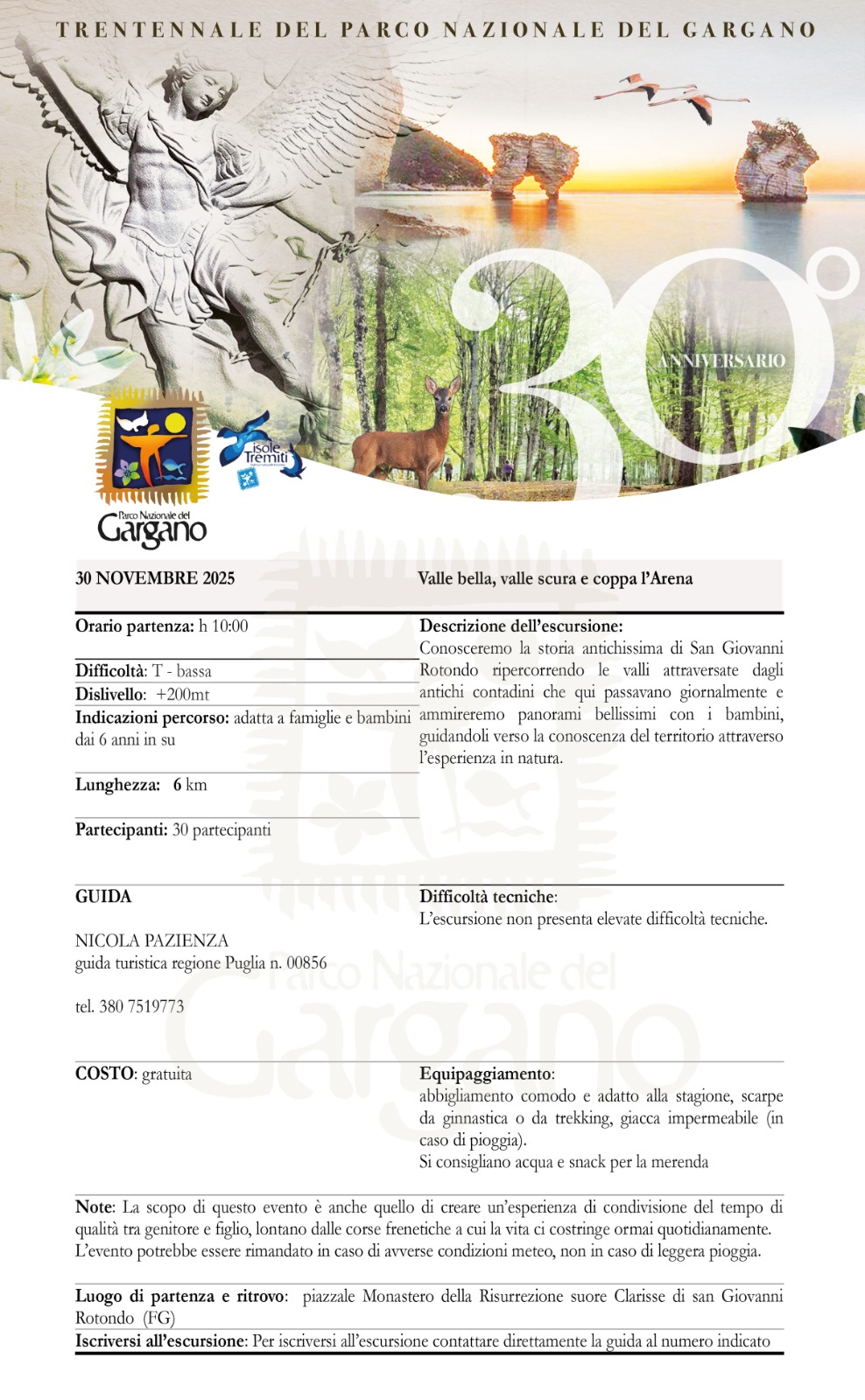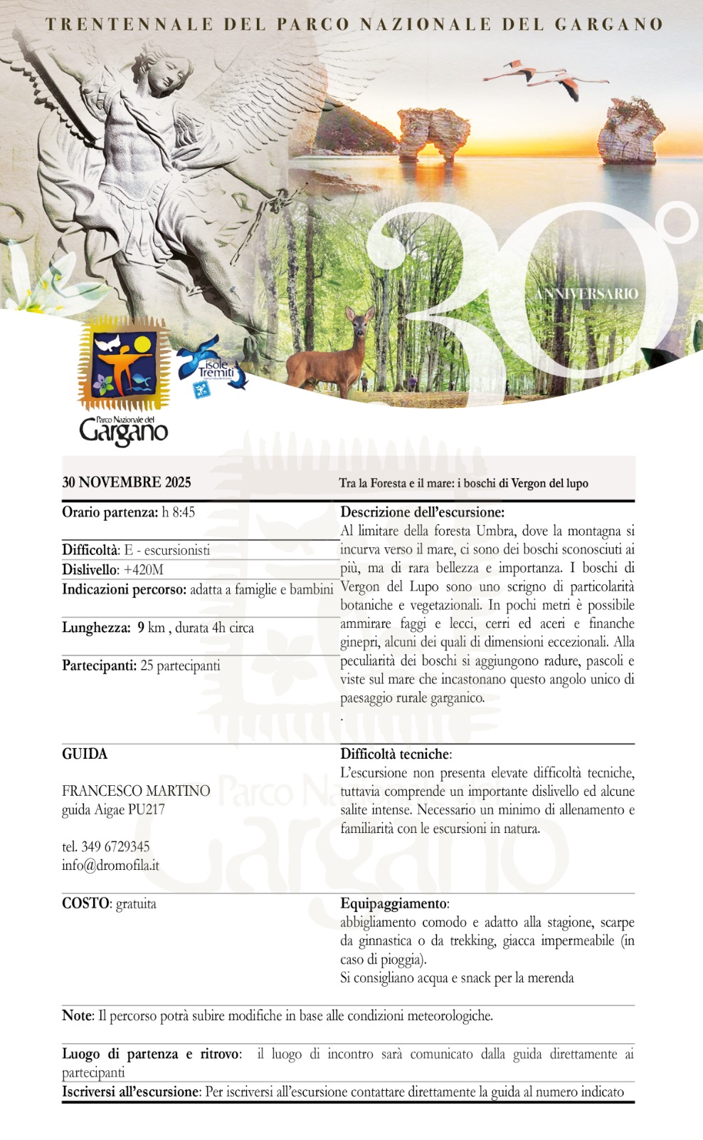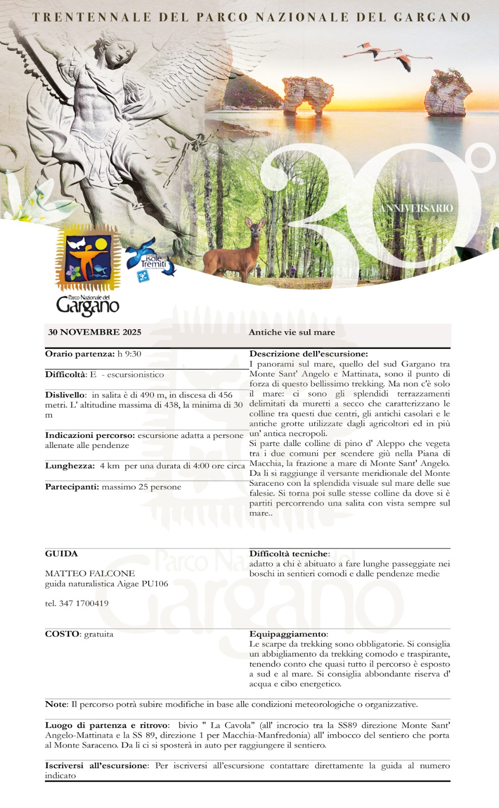 Tutte le escursioni sono gratuite. La prenotazione è obbligatoria contattando direttamente la guida indicata. È consigliato abbigliamento tecnico, scarpe da trekking, giacca antivento e acqua. Condividi la tua esperienza sui social con l’hashtag #TrentennaleParcoGargano.