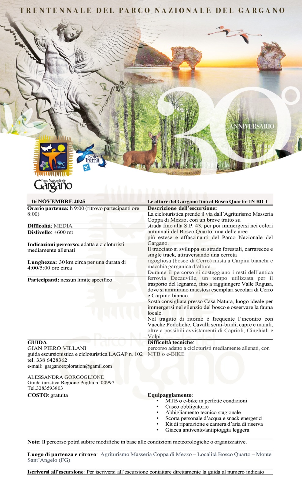 • Le alture del Gargano fino al Bosco Quarto – in bici – Guida Gian Piero Villani (LAGAP n.102), Agriturismo Coppa di Mezzo – Monte Sant’Angelo. Tel. 338 6428362 – garganoexploration@gmail.com – Programma