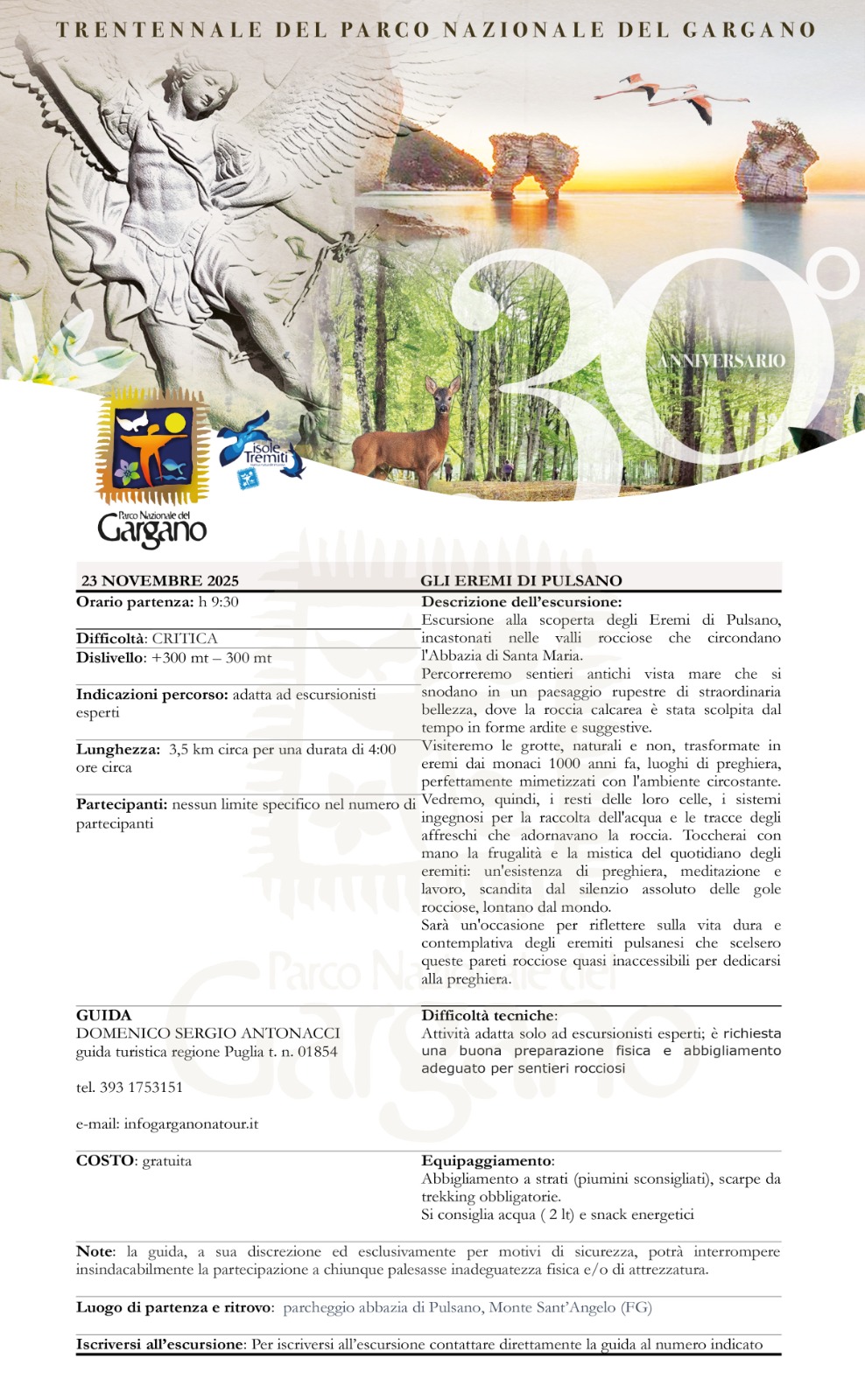 • Gli Eremi di Pulsano – Guida Domenico Sergio Antonacci, Monte Sant’Angelo – Abbazia di Pulsano. Tel. 393 1753151 – infogarganonatour.it – Programma