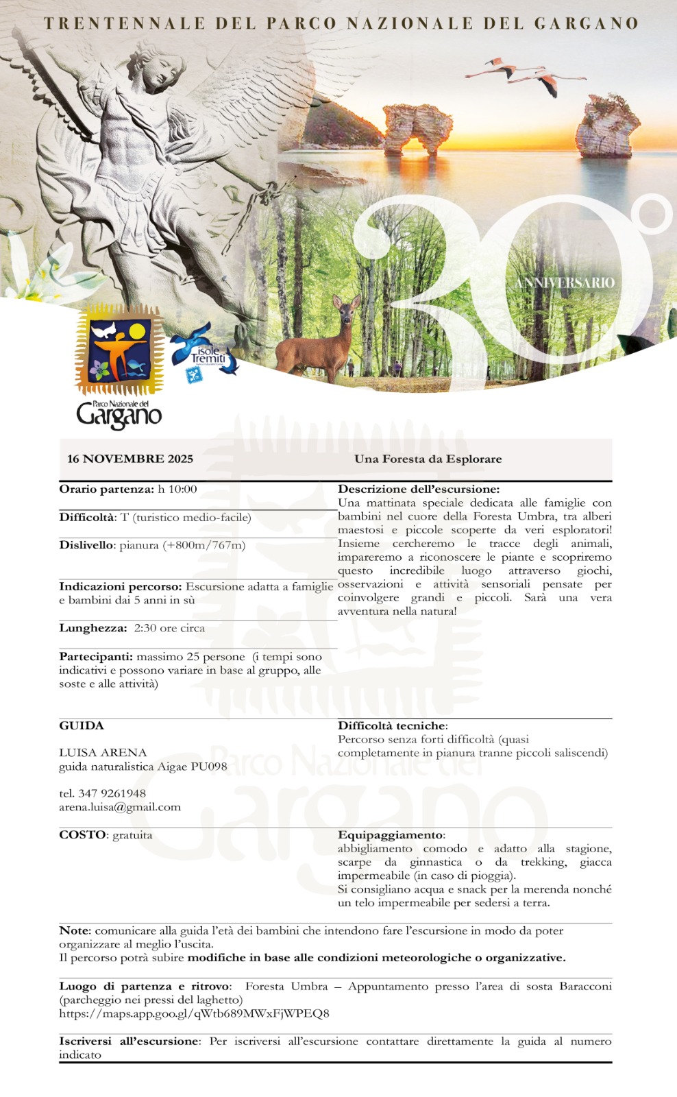 • Una Foresta da Esplorare – Guida Luisa Arena (AIGAE PU098), Area di sosta Baracconi, Foresta Umbra. Tel. 347 9261948 – arena.luisa@gmail.com – Programma