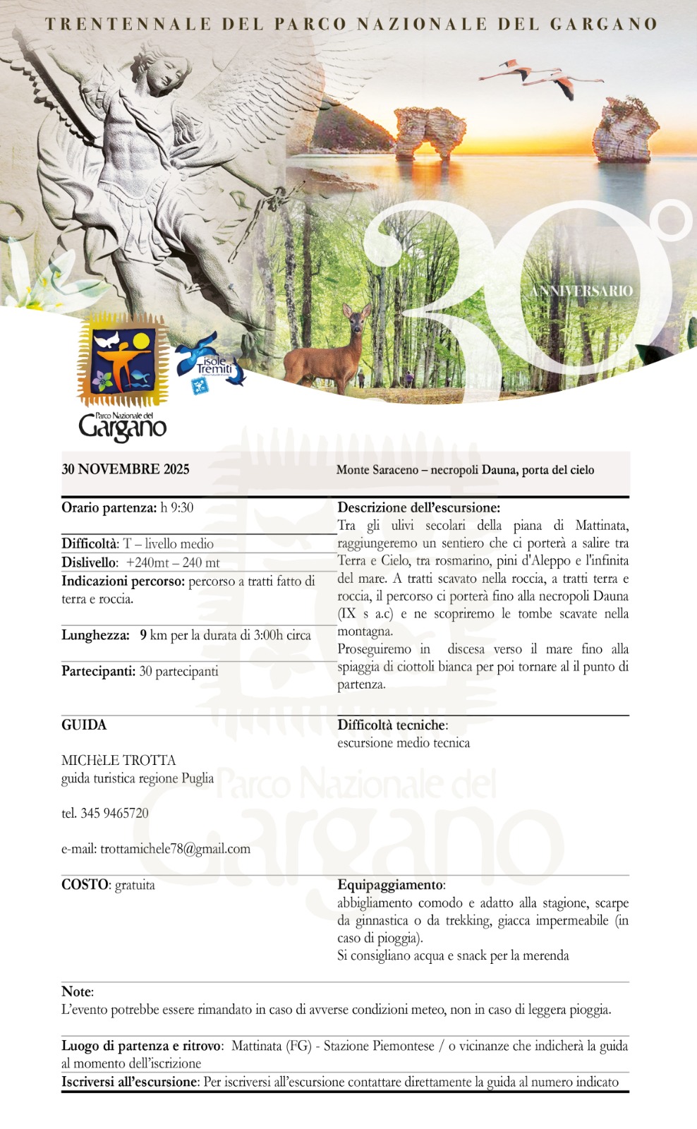 • Monte Saraceno – Necropoli Dauna, Porta del Cielo – Guida Michele Trotta, Mattinata. Tel. 345 9465720 – trottamichele78@gmail.com – Programma