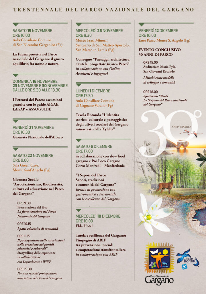 • Venerdì 12 dicembre – San Giovanni Rotondo: Evento conclusivo – Auditorium Maria Pyle: I Parchi come modello di sviluppo e comunità (ore 15:00) e Spettacolo Roots – Lo Stupore del Parco Nazionale del Gargano (ore 18:00)