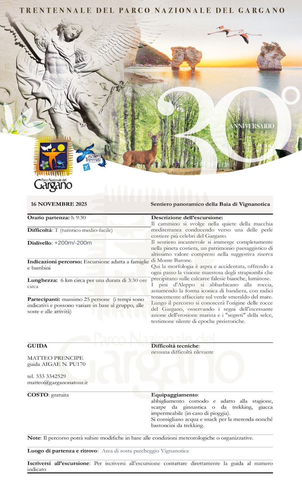 • Sentiero panoramico della Baia di Vignanotica – Guida Matteo Prencipe (AIGAE PU170), Parcheggio Vignanotica. Tel. 333 3342529 – matteo@garganonatour.it – Programma
